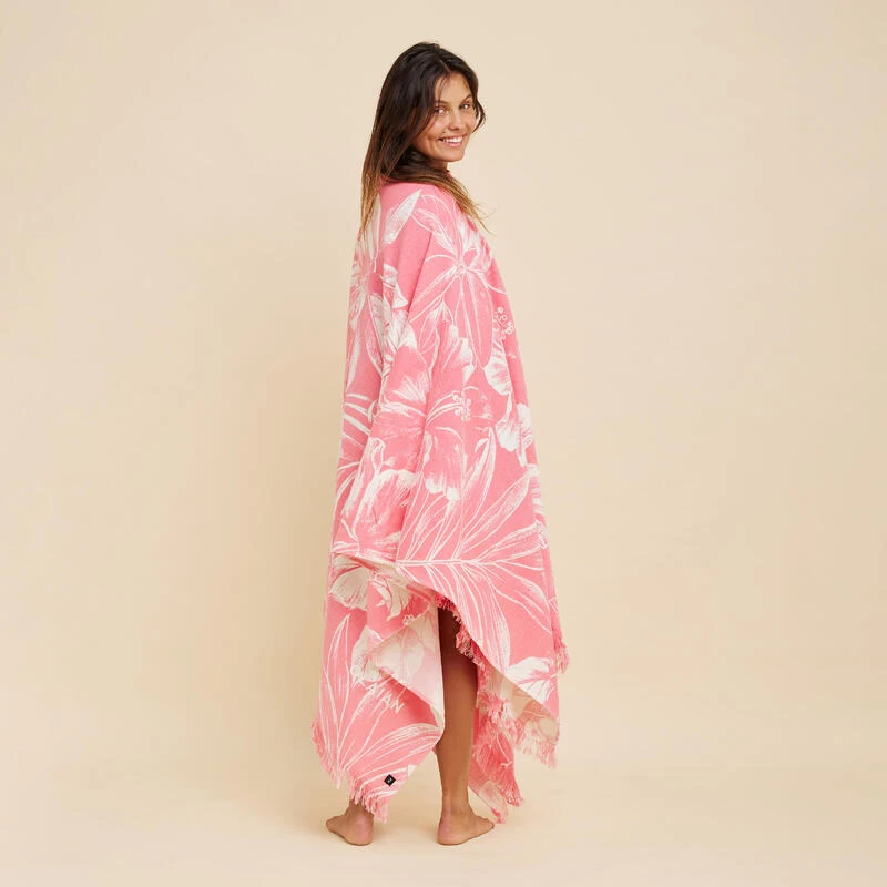 Fonction PONCHO « chauve souris », protégeant bien de la nudité, en ouvrant les boutons pressions du centre de la serviette pour permettre le passage de tête.